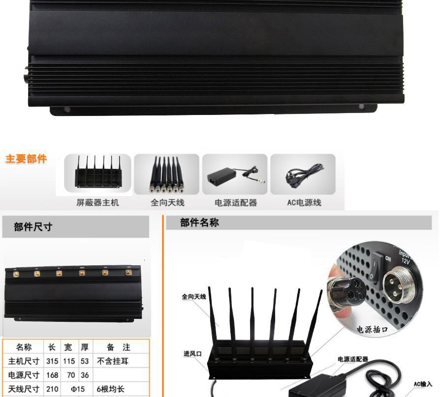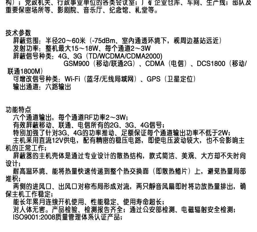 本产品是发射频率870~880MHz、930~960 MHz、1805~1920MHz、2010~2145MHz,2400~2500MHz,2300~2370MHZ,2555~2655MHZ的宽频带发射机(不含GSM、DCS、PCS,4G上行工作频率),是用于截断发射台(基站)与手机之间信号的无线装置,可以屏蔽2.4无线信号。