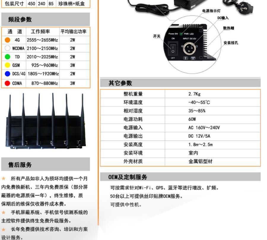 发射功率:32±3dbm 缓启动时间:3秒 完成屏蔽时间:30秒 环境温度:-25 ― +60°C 相对湿度:35-85% 电源适配器:输入AC100-240V 50/60Hz 机身尺寸:210mm*170mm*50mm 净重:2.0KG