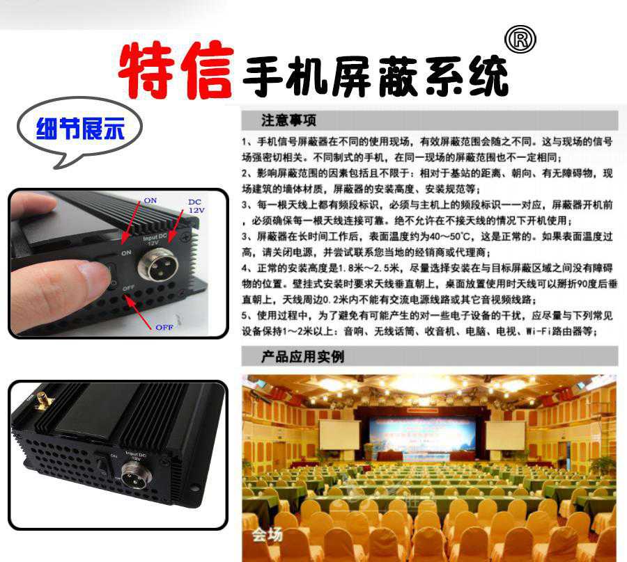 本产品可有效的屏蔽发射台(基站)与手机之间的微波信号,使需要屏蔽区域里(含GSM、CDMA、DCS、PHS、3G,4G)的手机与外界中断联系。本产品体积小巧、使用方便,通过单独和分布式布点,可应用于面积不等的多种环境。