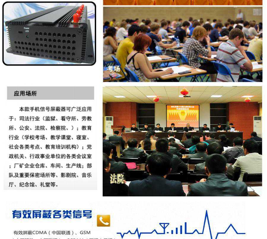 主要用于考场、监狱、法庭、会场、图书馆、剧院、教堂、加油站、油库、加汽站、医院等需要保密、安静、防暴、防干扰的场所。