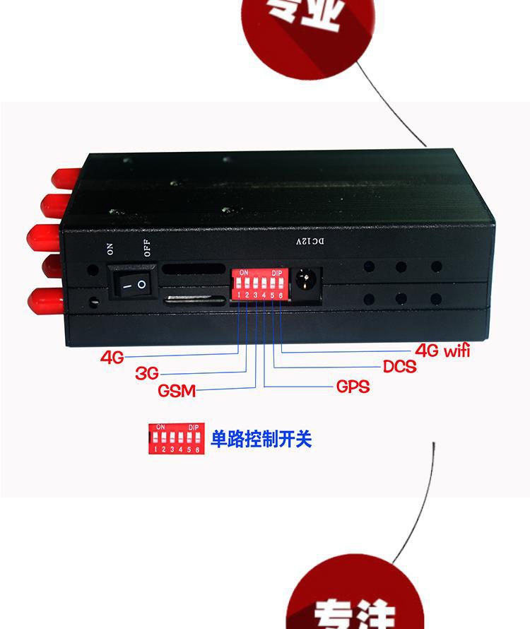 本产品是发射频率870~880MHz、930~960 MHz、1805~1920MHz、2010~2145MHz,2400~2500MHz,2300~2370MHZ,2555~2655MHZ的宽频带发射机(不含GSM、DCS、PCS,4G上行工作频率),是用于截断发射台(基站)与手机之间信号的无线装置,可以屏蔽2.4无线信号。