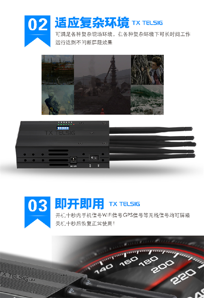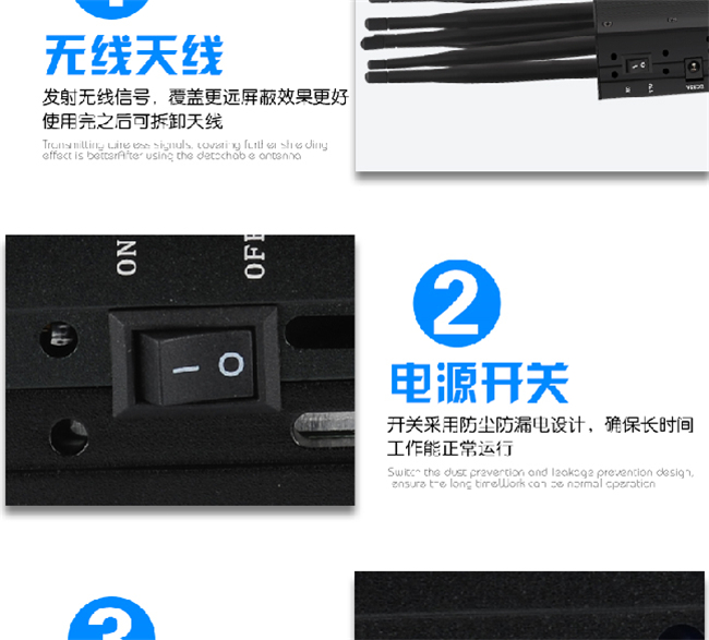 开启电源开关前确保已连接所有天线;当第一次使用设备时请在电池完全耗尽前提下为该设备充电;为延长电池的使用寿命,尽量给电池充电不少于12个小时; 为避免干扰器在过湿,过烫,高电压和高磁的环境下使用出现问题,请不要把机器放入水中或火中 天线罩仅作为保护和隐藏天线使用,实际使用过程中,可根据需要决定是否装卸天线罩; 为获得更好的屏蔽效果,尽量在使用时确认天线是垂直于地面的;机器上任何密封标志撕破则质保无效;