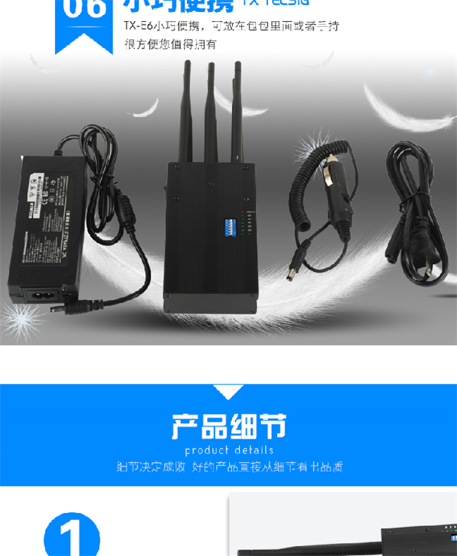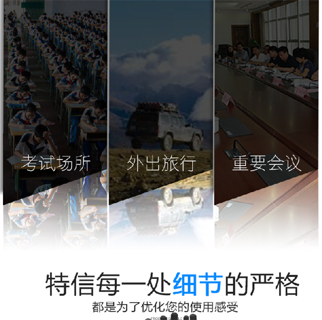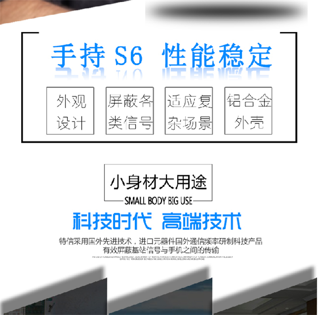 体积小:手持式设计、一手即可掌握,大小与常用手机或对讲机相当; 便携带:可装入衣兜、挎包里,可以悬挂或者穿戴在手臂及腰带上; 功率大:能有效屏蔽半径1~15米内所有常用手机信号; 稳定性:精美的通风散热设计,即使连续开机2小时,机壳温度都不会超过45℃; 电池供电:采用安全的磷酸铁锂大容量电池、可反复充电使用,可交流充电和车载充电; 专业性:可对不同制式的手机有选择的进行屏蔽; 个性定制:针对不同国家、地区或不同的屏蔽要求,定制不同的屏蔽信号种类;