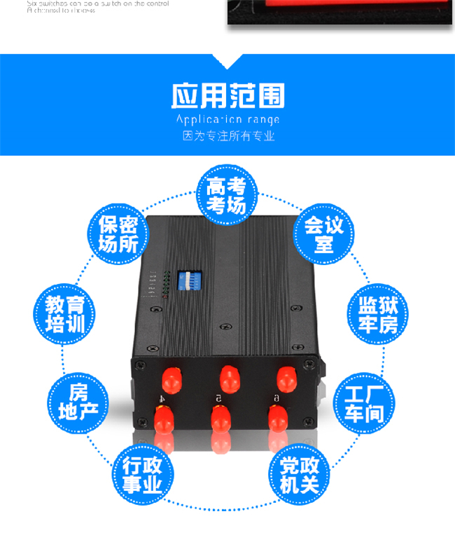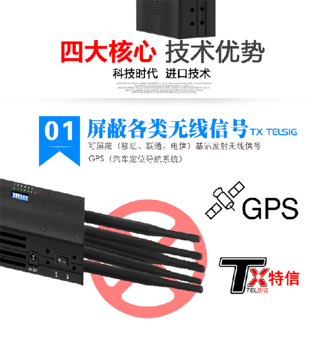 屏蔽范围:半径1~15米(-75dBm、室内通透环境下,视周边基站远近) 发射功率:整机≥4W 屏蔽信号种类:GSM(移动/联通2G)、CDMA(电信)、DCS(移动/联通1800M)、3G(移动TD、电信、CDMA2000、联通WCDMA)、4G(LTE/2.6G)GPS(L1 1575.42NHZ) GPS(L2 1200-1300NHZ) 可增改信号种类:可增改GPS(定位/卫星电话)、WiFi,或按照国标、美标、欧标等频段定制,六个通道输出,有频段开关,可对不同制式手机进行选择屏蔽