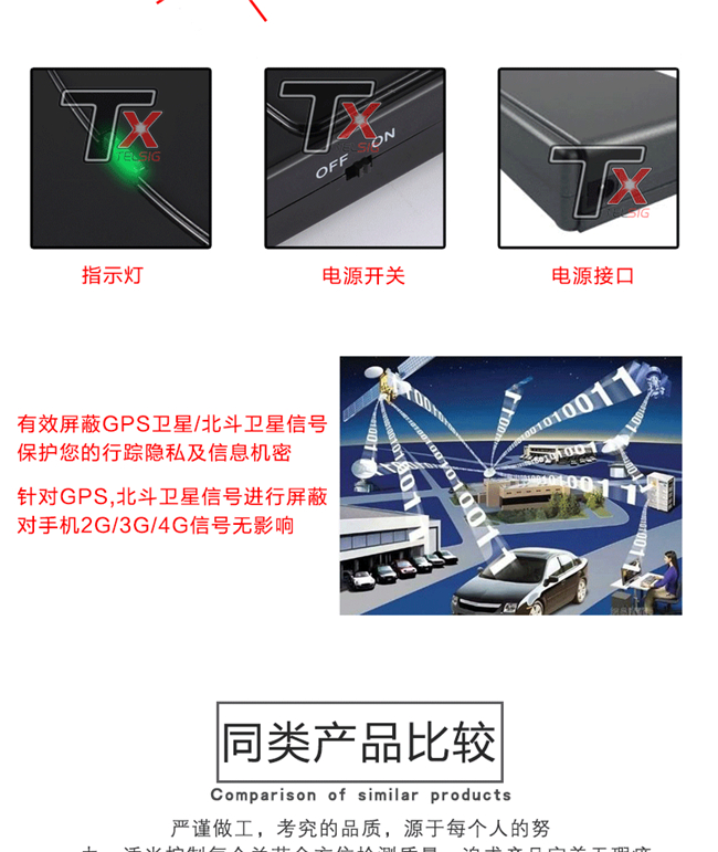 特信TX-SJ 特信TX-N3手持式GPS信号屏蔽器GPRS手机信号屏蔽器是我厂根据目前泛滥的卫星定位汽车GPS定位、给一些保密单位及个人带来的不便而特别计生产的,针对目前所有GPS卫星定位系统的特点,在使用特信TX-SJ的半径1-15米范围内有效的对GPS卫星信号进行干扰,从而形成一个有效的保护区域,让你的行踪不担心被跟踪。