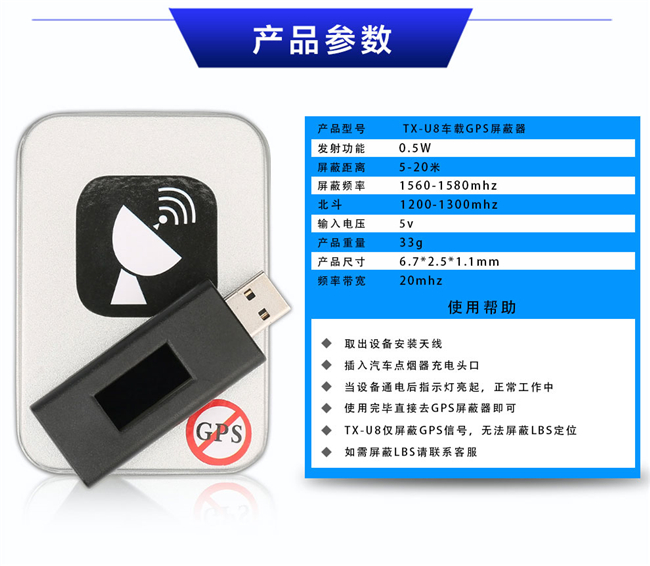 特信TX- USB卫星信号屏蔽器GPS屏蔽器北斗屏蔽器是我厂根据目前泛滥的卫星定位汽车GPS定位、给一些保密单位及个人带来的不便而特别计生产的,针对目前所有GPS卫星定位系统的特点,在使用本产品的半径5-15米范围内有效的对GPS卫星信号进行截断,从而形成一个有效的保护区域,让你的行踪不担心被跟踪。
