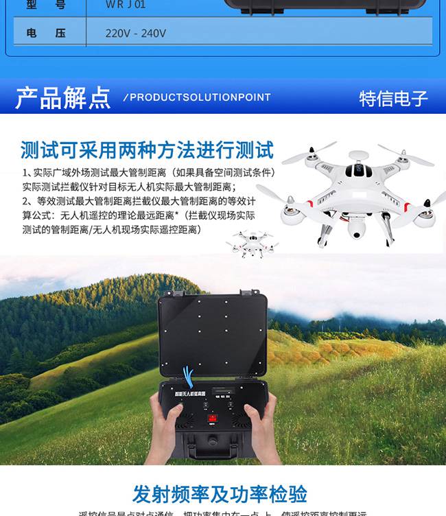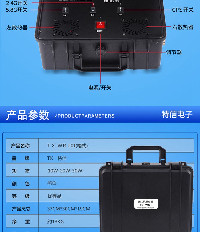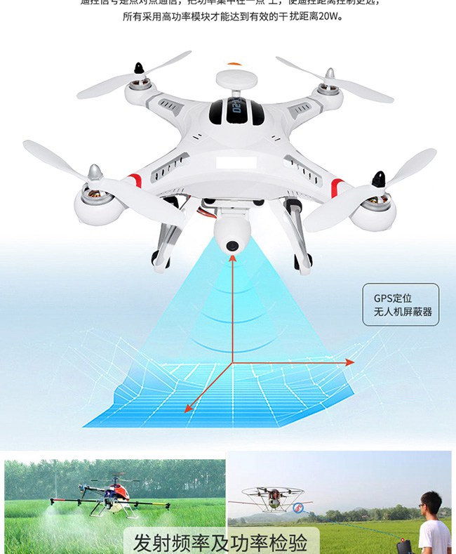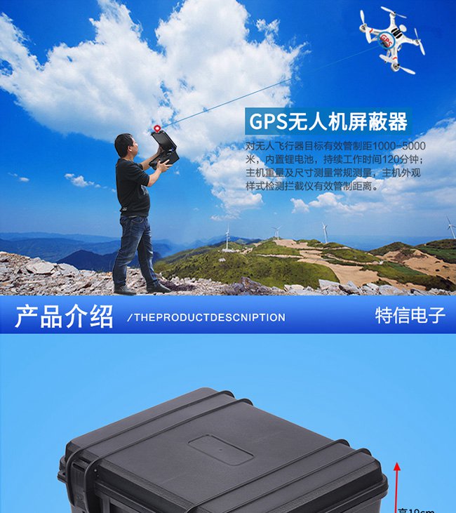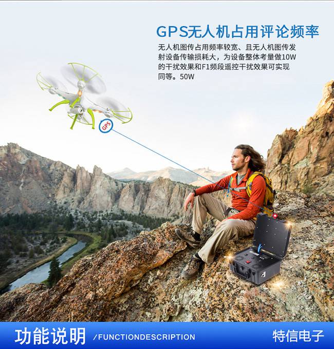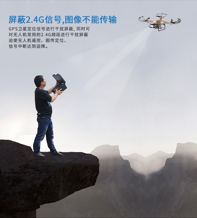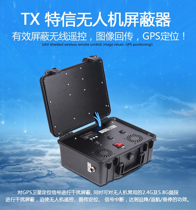 深圳市特信电子有限公司对GPS卫星定位信号进行干扰屏蔽, 同时可对无人机常用的2.4G及5.8G频段进行干扰屏蔽,迫使无人机遥控、图传定位、 信号中断达到迫降/返航/悬停无法控制的功效。