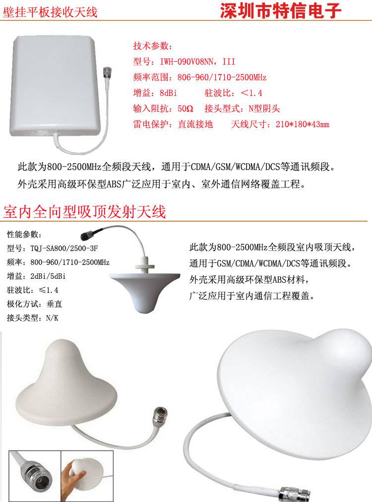 安装要求:室外采用高增益800-2500MHZ定向天线,室内采用800-2500M HZ全向吸顶天线或者高增益平板天线。功分器,接头采用N-K或F型,信号传输线采用50欧姆-7或者75欧姆-7双屏蔽同轴电缆。