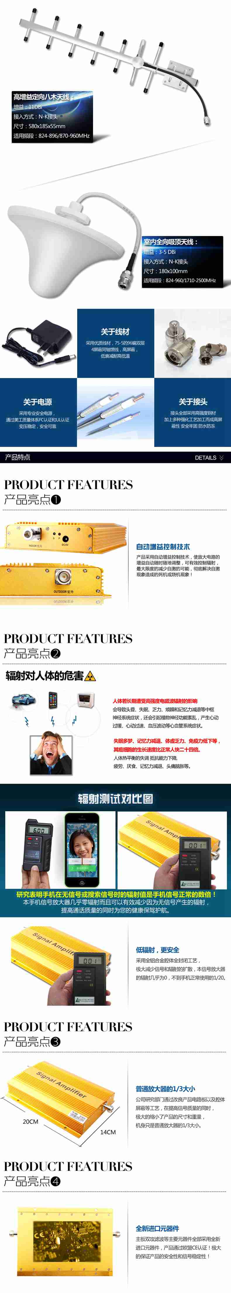 特点:低噪音,全双工,单天线设计,机型款式多样,各种频率分别适合不同国家和地区使用,所有机器都采用自动增益控制,性能稳定,增益高,穿透能力强,覆盖面积达500-2000平方米。